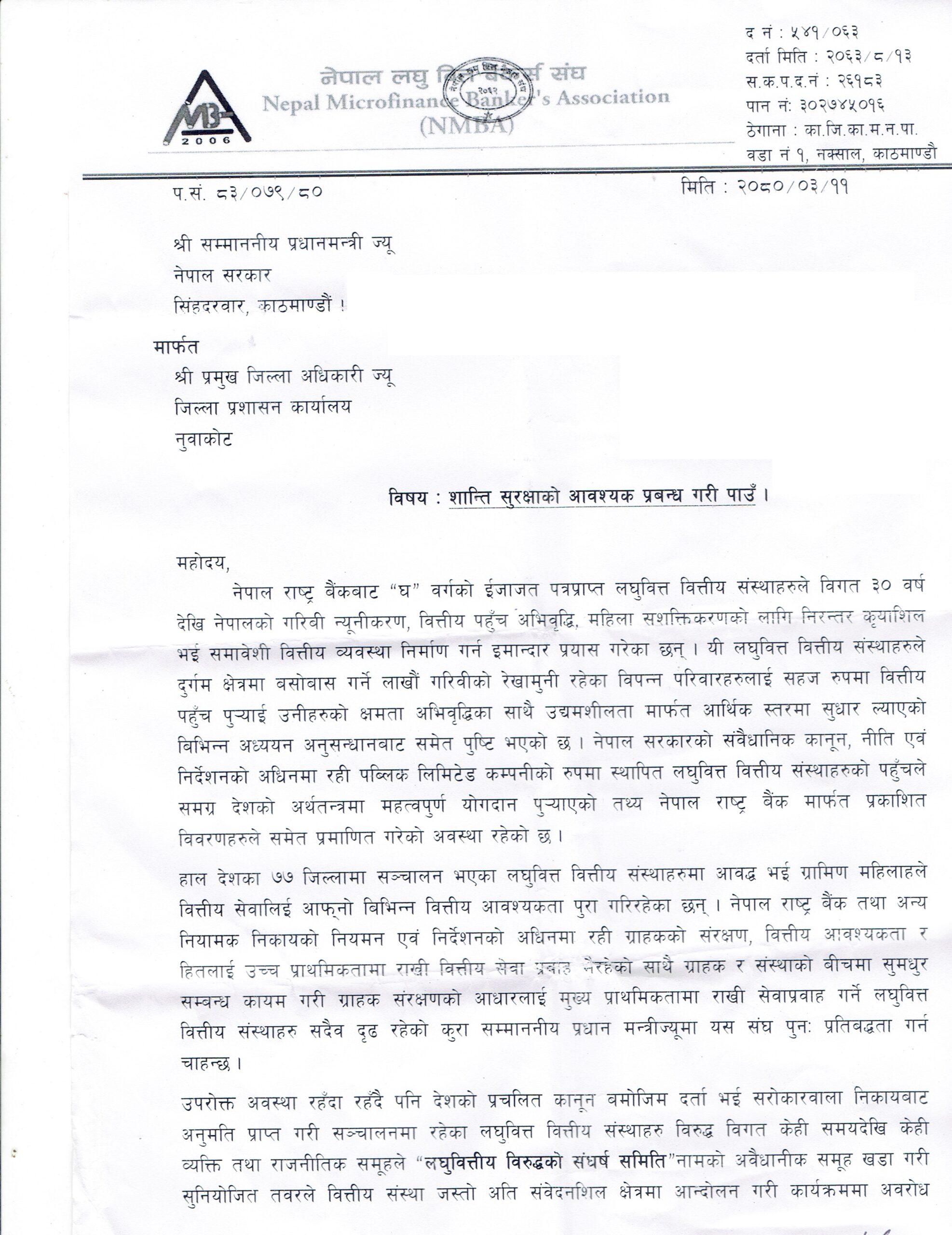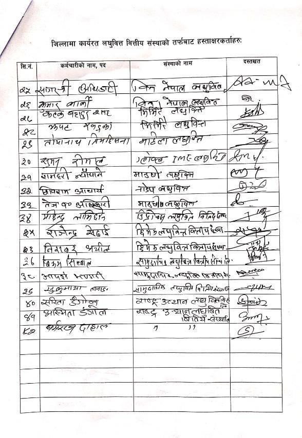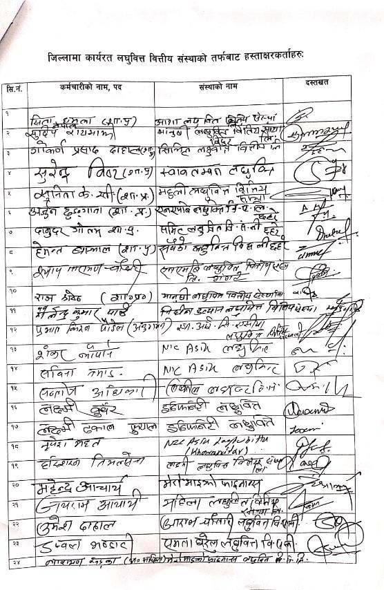 नेपाल लघुवित्त बैकर्स संघको आयोजनामा आज देशभरबाट प्रमुख जिल्ला अधिकारी मार्फत वित्तीय सँँस्थाको शान्ति सुरक्षाको माग तथा अराजक गतिविधि रोक्न गर्न माग गर्दै प्रधानमन्त्री पुष्पकमल दाहाल प्रचण्डको ध्यानाकर्षण गराइएको हो ।