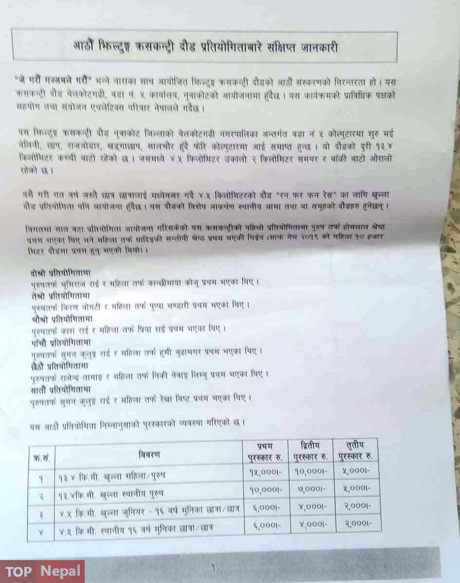 १३.४ किमी हुने दौडमा खुल्ला पुरुष तर्फका विजेताले समान १५ हजार, दोस्रोले १० हजार र तेस्रोले ५ हजार रुपैयाँ नगद पुरस्कारप्राप्त गर्ने पत्रकार सम्मेलनको क्रममा वडा नं .५ का वडा सदस्य गोकर्णप्रसाद नेपालले जानकारी दिनुभयो । उहाँको अनुसार महिला तर्फको विजेताले १० हजार, दोस्रोले ७ हजार र तेस्रोले ५ हजार रुपैयाँ पुरस्कार प्राप्त गर्नेछन् ।