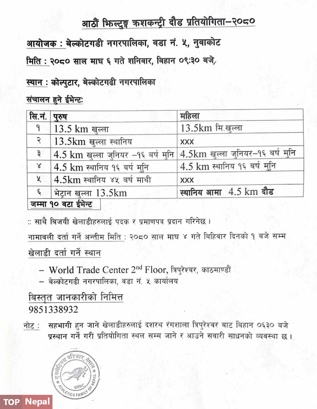 त्रिशूली । नुवाकोटको बेलकोटगढी नगरपालिका वडा नं. ५ मा झिल्टुङ्ग क्रसकन्ट्री दौडको यस वर्ष पनि आठौँ संस्करण माघको पहिलो सातामा हुने भएको छ।