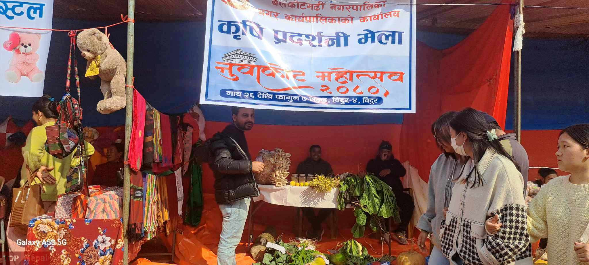 विदुर । विदुरमा जारी रहेको आठौँ नुवाकोट महोत्सवमा जिल्लाको बेलकोटगढी नगरपालिका भित्रका विभिन्न स्थानका किसानले उत्पादन गरेको कृषि उपज सामाग्रिको आकर्षण र लोकप्रियता धेरै भइरहेको छ । महोत्सवमा प्रवेश गरेपछि दायाँ तिरको स्टल नं. २१० मा राखिएको बेलकोटगढी नगरपालिकाको किसानको केराको घरी, तरुल, आलू लगायतका कृषि उब्जनीले अवलोकनकर्ताको ध्यान तानेको हो ।