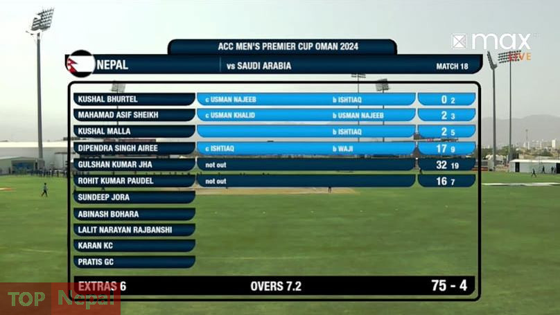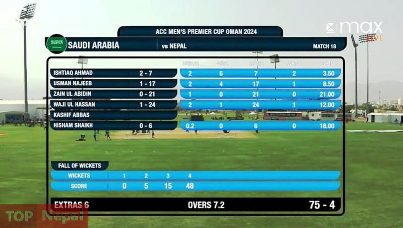 ओपनर कुशल भुर्तेल डक, आसिफ शेख र कुशल मल्ल २(२ रनमा आउट भए । एक समय २.२ ओभरमा १५–३ को अवस्थामा पुगेको नेपाललाई गुलशन झा र दीपेन्द्रसिंह ऐरीले ३३ रनको साझेदारी गरेका थिए । दीपेन्द्र ९ बलमा ३ चौकासहित १७ रनमा आउट भए । साउदीका ईश्ताक अहमदले २, उस्मान नाजिव र वाजी उल हसनले १–१ विकेट लिए ।
