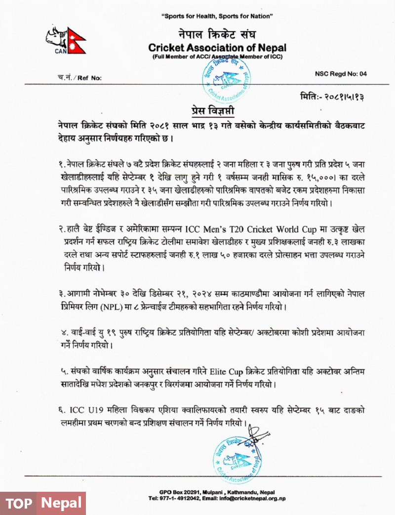 क्यानले प्रत्येक प्रदेशका २ जना महिला र ३ जना पुरुष खेलाडी गरी देशका सबै ७ प्रदेश क्रिकेट सङ्घका कुल ३५ जना प्रादेशिक खेलाडीलाई १५ हजार रुपैयाँ मासिक तलब पनि दिने भएको छ । म्याच फिक्सिङमा अदालतबाट सफाई पाएका क्रिकेटर आदिल आलमको निलम्बन फुकुवाबारे भने क्यानले आईसीसीको निर्देशन पर्खेको छ ।