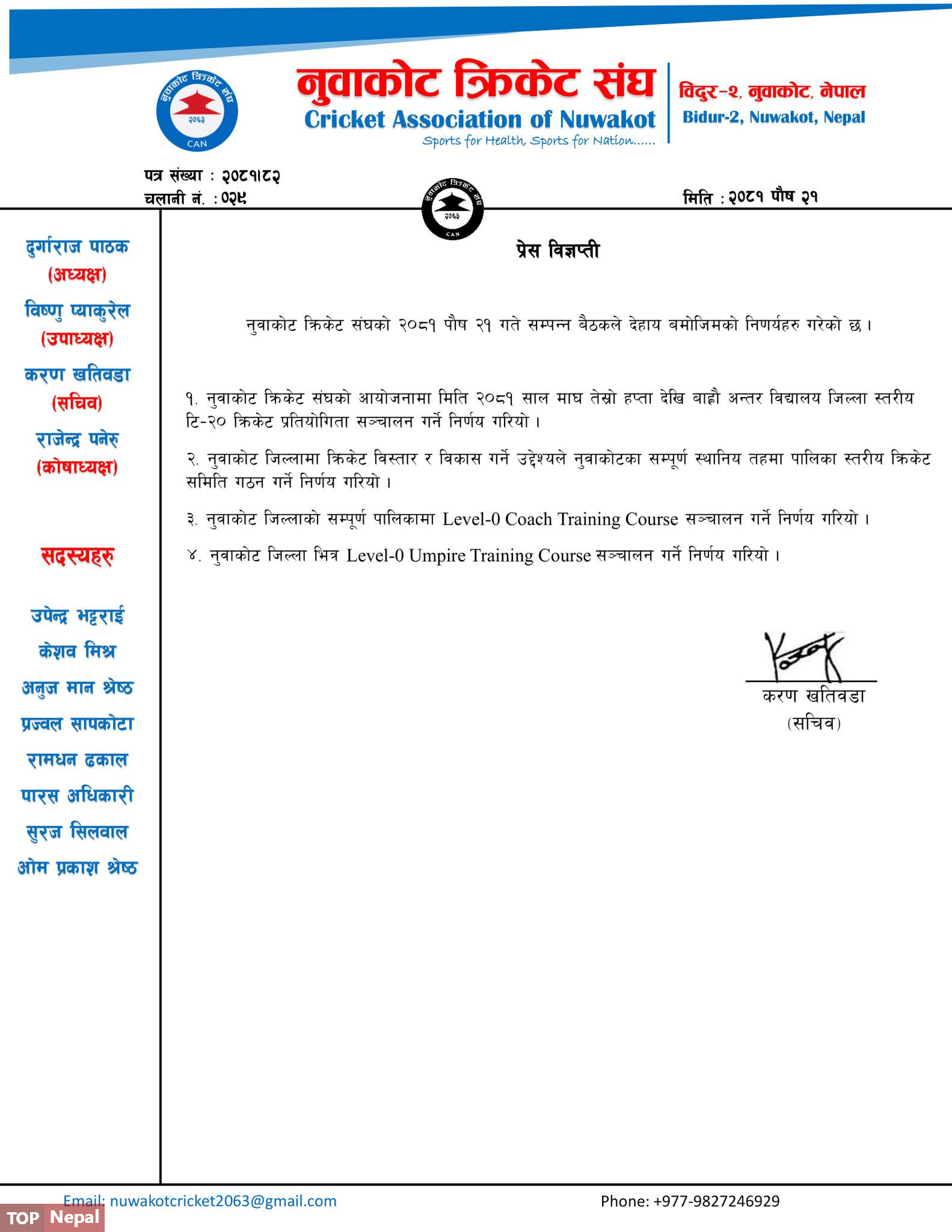 संघका नुवाकोट सचिव करण खतिवडाको अनुसार आइतबार बसेको बैठकले नुवाकोट क्रिकेट संघले माघको तेश्रो साता बाह्रौँ अन्तर विद्यालय जिल्लास्तरीय टी–२० क्रिकेट प्रतियोगिता आयोजना गर्ने, नुवाकोट जिल्लामा क्रिकेटको विकास र विस्तार गर्नका लागि जिल्लामा रहेका सबै स्थानीय तहमा पालिकास्तरीय क्रिकेट समिति गठन गर्ने, नुवाकोट जिल्लामा रहेका सबै पालिकामा Level-o को प्रशिक्षक प्रशिक्षण कोर्ष सञ्चालन गर्ने र नुवाकोट जिल्ला भित्र Level-O को अम्पायर प्रशिक्षण कोर्ष सञ्चालन गर्ने निर्णय गरेको हो ।