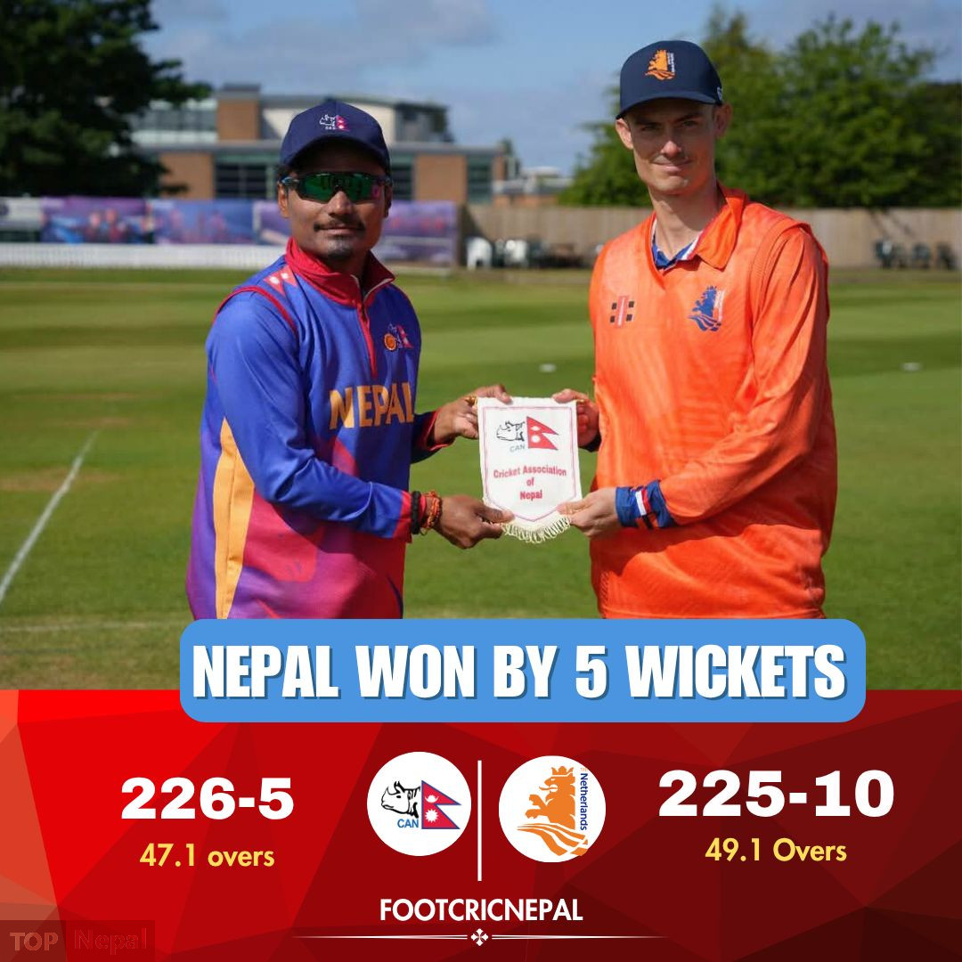 स्कटल्यान्डको डुन्डीमा सम्पन्न खेलमा आरिफ शेखको अर्धशतकमा नेदरल्यान्ड्सले प्रस्तुत गरेको २२६ रनको लक्ष्य नेपालले ४७.१ ओभरमा पाँच विकेट गुमाएर पूरा गर्यो ।