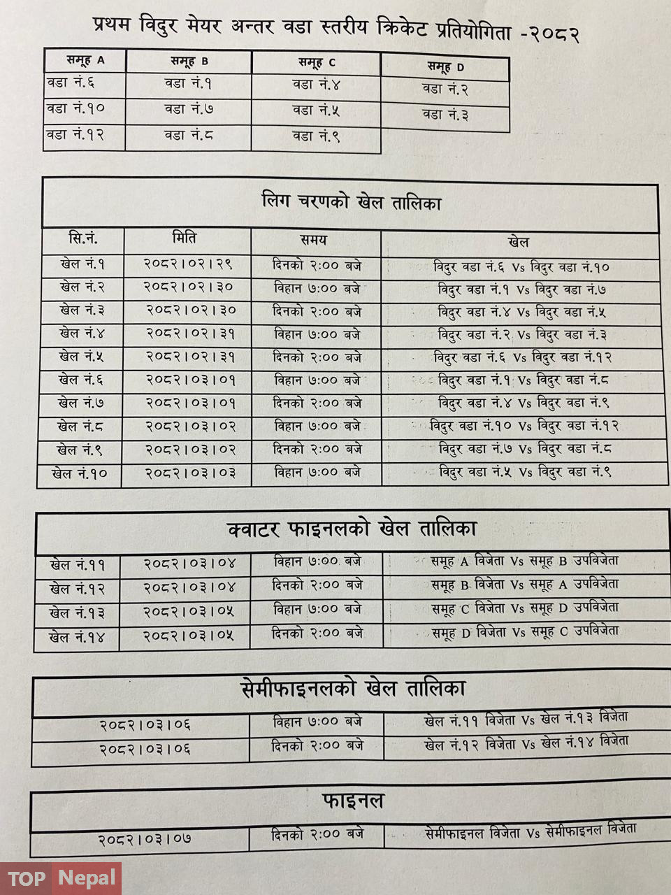 नुवाकोट । विदुर नगरपालिकाको आयोजना र नुवाकोट क्रिकेट संघको प्राविधिक सहयोगमा सञ्चालन हुन लागेको ‘प्रथम विदुर मेयर अन्तर वडास्तरीय क्रिकेट प्रतियोगिता’को समूह विभाजन (लक्कि ड्र)खेल तालिका (टाईसिट) सार्वजनिक गरिएको छ ।