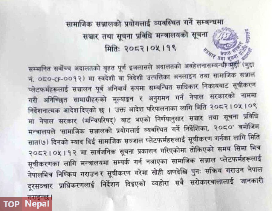 सञ्चार तथा सूचना प्रविधिमन्त्री पृथ्बीसुब्बा गुरुङ र मन्त्रालयका अधिकारीहरू, नेपाल दूरसञ्चार प्राधिकरण, टेलिकम अपरेटर, इन्टरनेट सेवा प्रदायक कम्पनीका प्रतिनिधि सहभागी बैठकपछि दर्ता नभएका सामाजिक सञ्जालहरु बन्द गर्ने निर्णय भएको छ ।