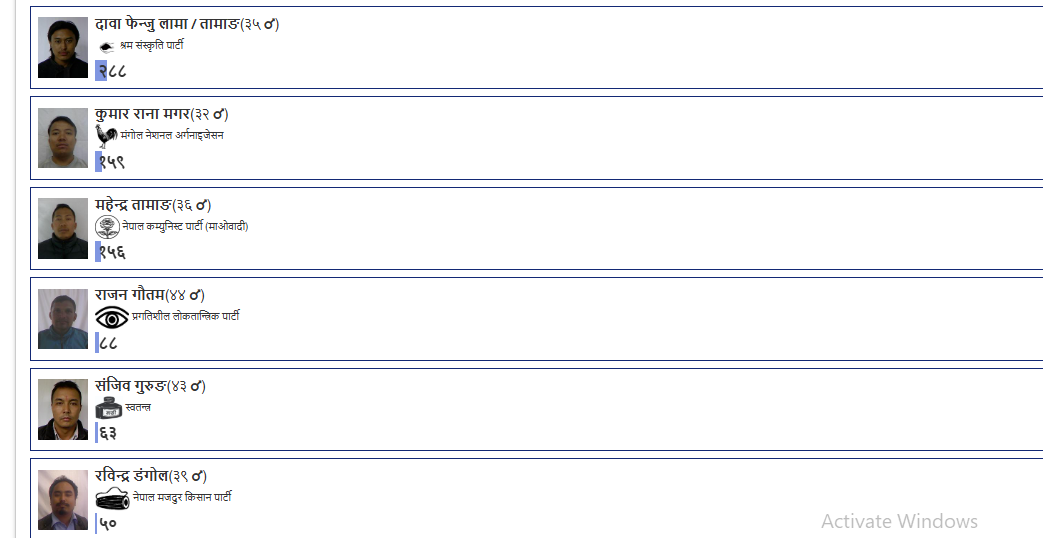 यस्तै, नेपाली कम्युनिष्ट पार्टीका हितबहादुर तामाङले १३ हजार ३७७ मत, नेकपा (एमाले)का उम्मेदवार बद्री मैनालीले आठ हजार ९३२ मत र उज्यालो नेपाल पार्टीका उम्मेदवार अमित तामाङले दुई हजार ६३ मत ल्याउनुभयो ।