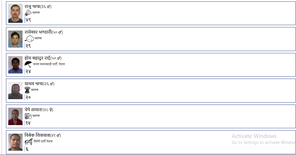 यस्तै, नेपाल मजदुर किसान पार्टीका रबिन्द्र डंगोल ५० मत, जनता समाजवादी पार्टीका होमबहादुर राईले २४ मत र मितेरी पार्टी नेपालका बिवेक सिलवालले ६ मत प्राप्त गरेको सहायक निर्वाचन अधिकृत प्रमोद रिजालले जानकारी दिनुभयो ।