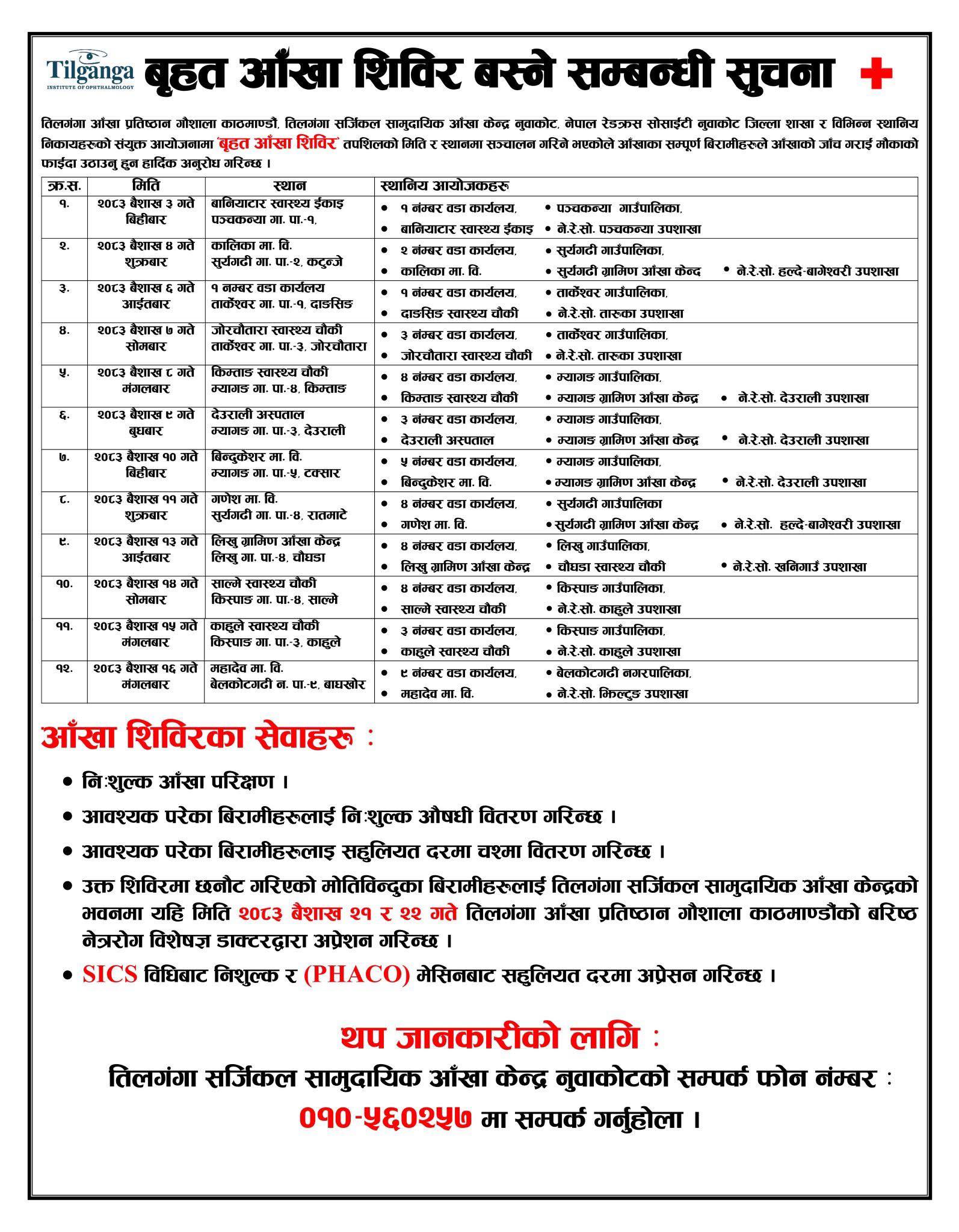 नेपाल आँखा कार्यक्रम–तिलगंगा आँखा प्रतिष्ठान सर्जिकल आँखा केन्द्र नुवाकोटको समन्वयनमा नयाँ वर्ष २०८३ लागेलगत्तै सुरु भएको मोतियाविन्दु छनौट शिविर यही बैशाख महिनामा जिल्लाको विभिन्न बाह्र स्थानमा आयोजना गरिएको छ ।