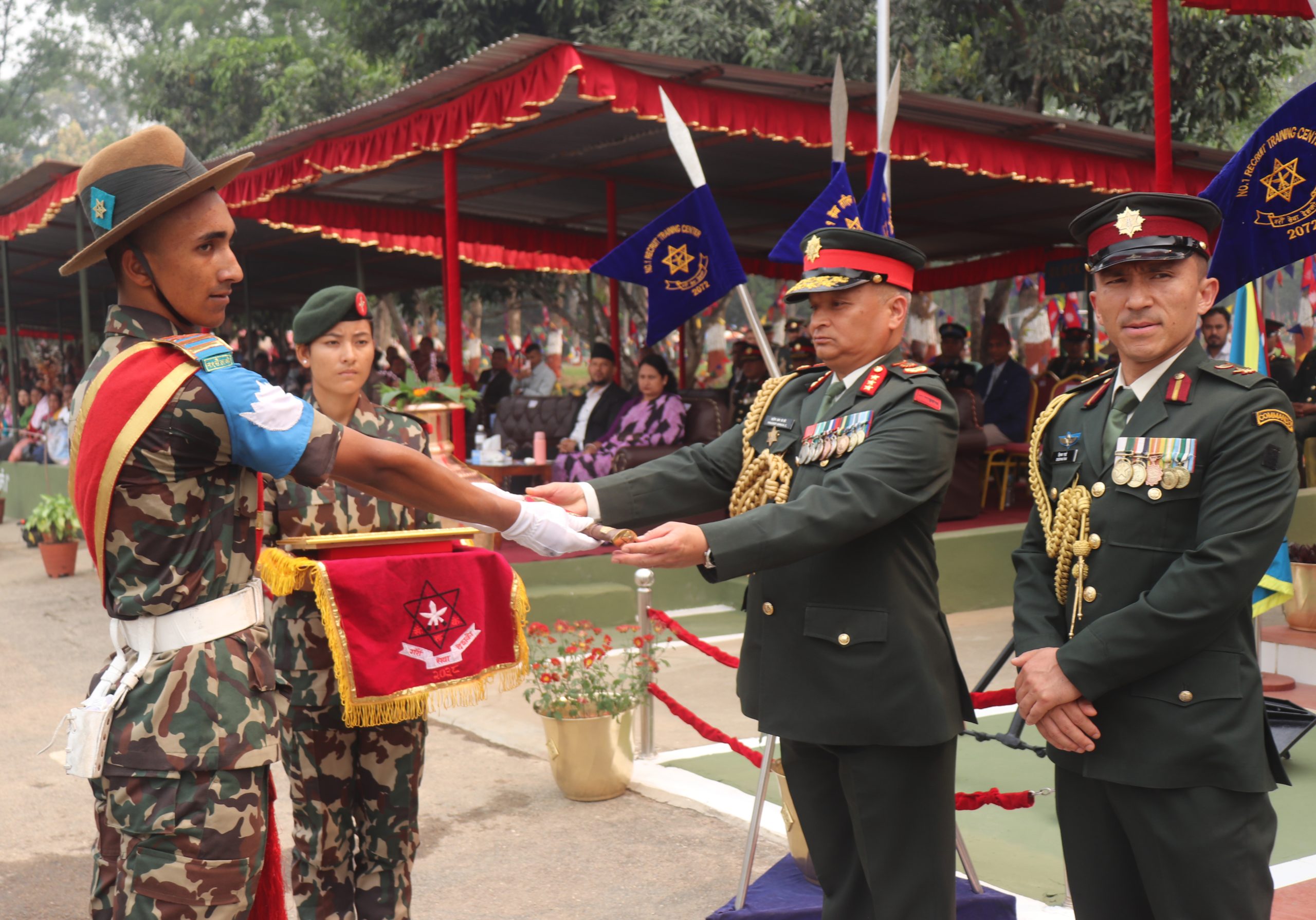 सैन्यबाट सिपाही भएकालाई बलाधिकृत रथी प्रदीप जंग केसीले विशेष समारोहका बीच अन्तिम दलेल कवाज निरीक्षणगर्दै जनता, सैनिक संगठन र राष्ट्रको रक्षाको लागी जिम्मेवारी बहन गर्न निर्देशन दिनुभयो ।